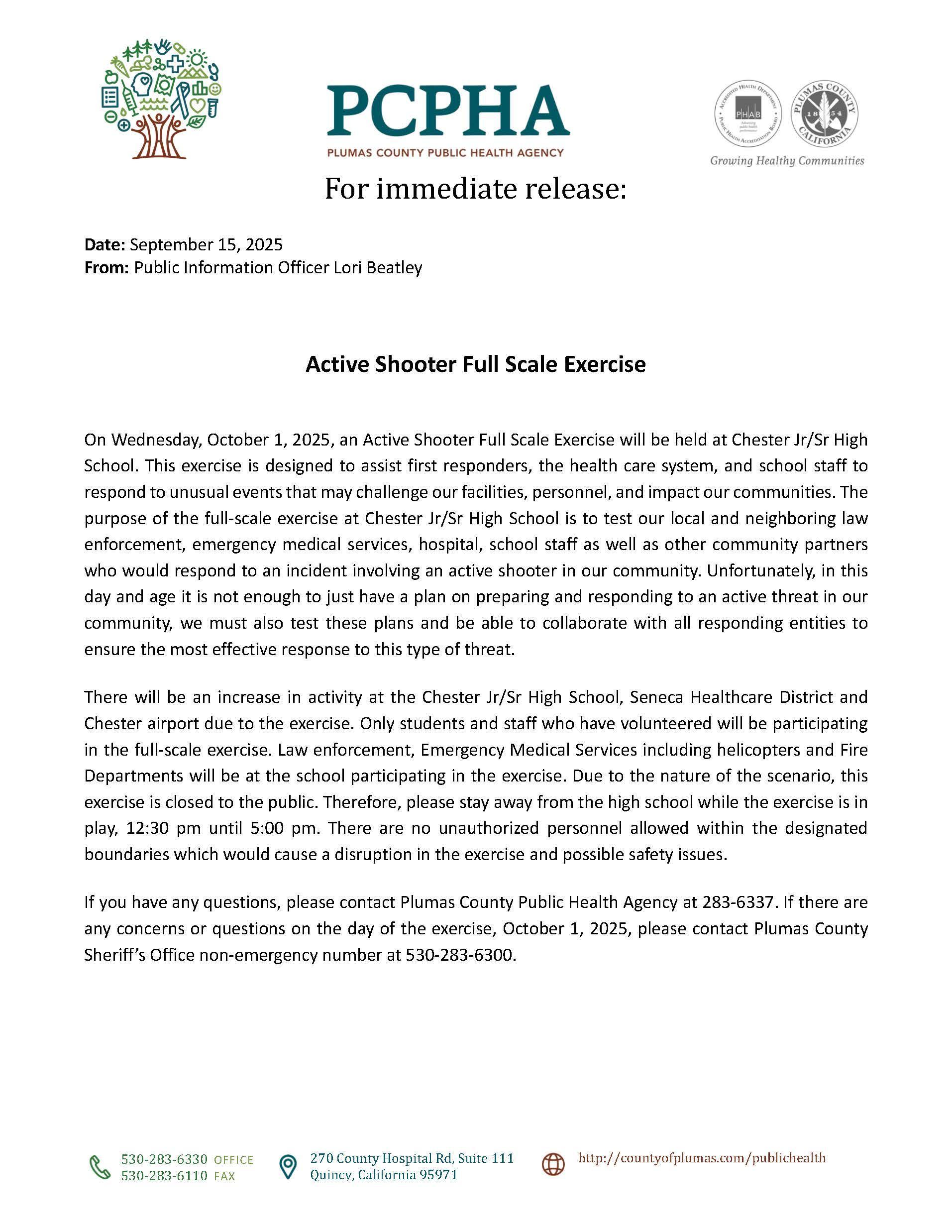 If you have any questions in advance, please contact Plumas County Public Health Agency at (530) 283-6337.